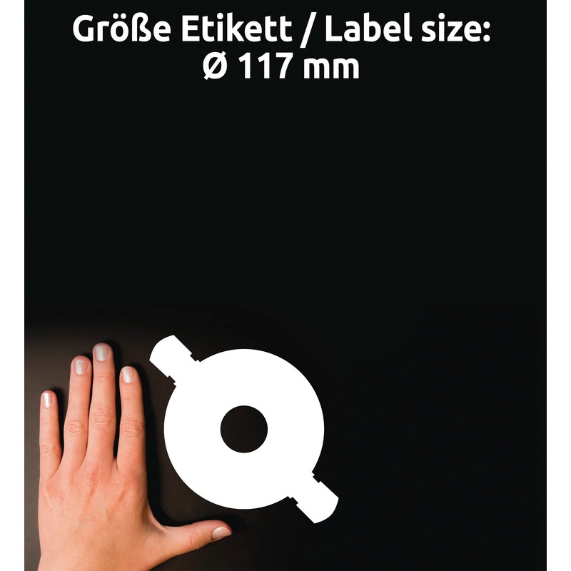 - Ideal for ClassicSize CDs: practical 25 sheets. Pack of 50 self-writeable CD labels in the format diameter 117 mm - two CD stickers per A4 sheet