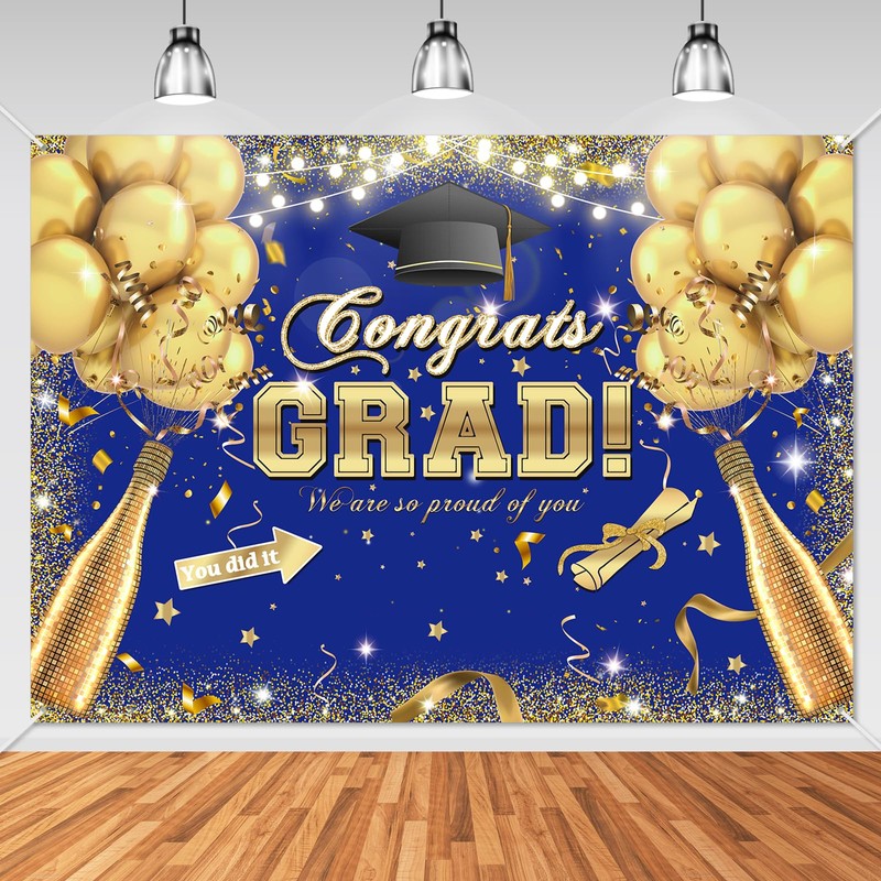 - [Original Design]: Our brand insists on independent design and follows the trend. This backdrop can be used as We are so proud of you celebration party backdrop, Congrats university grad backdrop, Congrats primary school grad backdrop,Congrats high school grad backdrop, Graduation party photoshoot backdrops, Gold balloon fireworks ribbon party decorations backdrops.