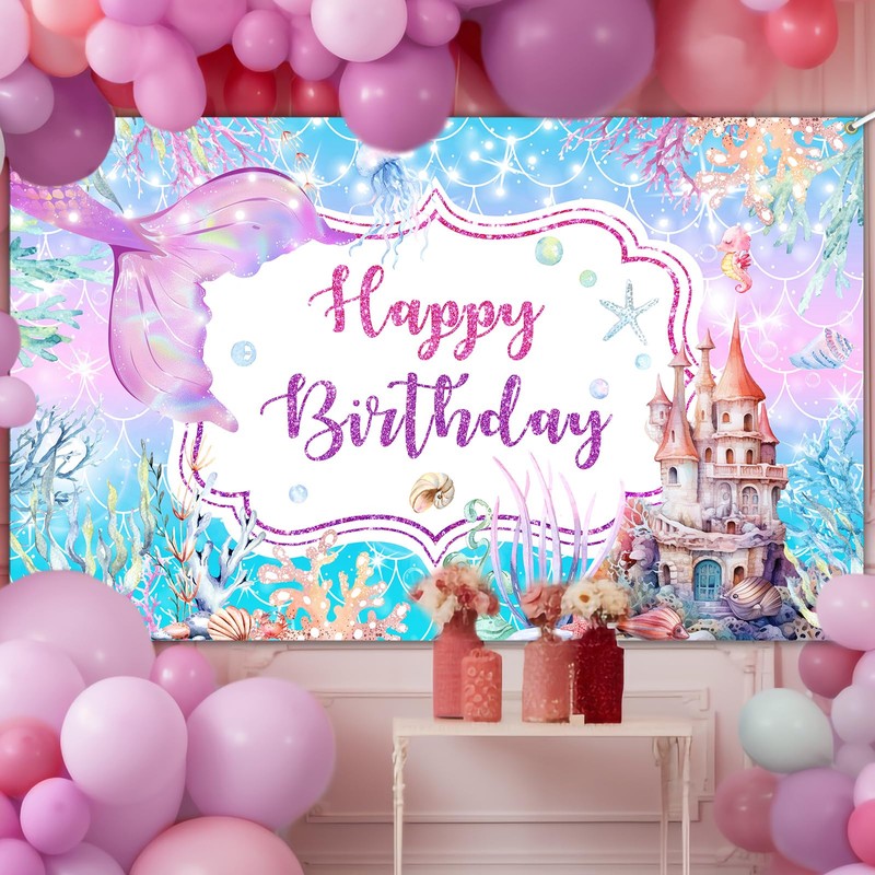 - Vibrant Mermaid Theme Design: This mermaid birthday backdrop features enchanting under-the-sea graphics with purple hues, perfect for creating a magical ocean-themed party atmosphere