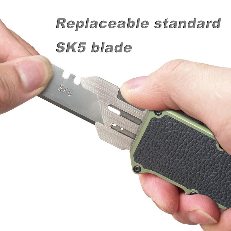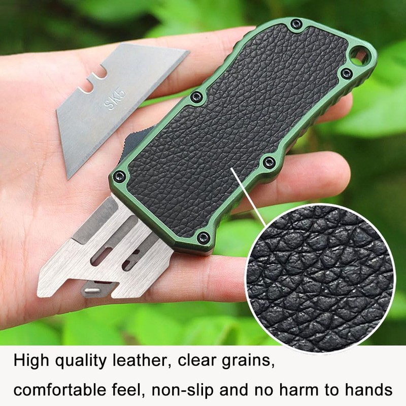 Aviation Aluminum Box Cutter Pocket Knife, EDC Auto Utility Knife Retractable, Replaceable Razor Blade Double Action Automatic Boxcutters With Clip, With 5pcs Spare Blades (Green-leahter)