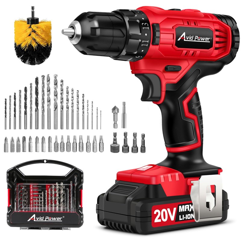 - [Powerful Battery Pack]: The Avid power 20V Cordless Drill Set is supplied with a powerful Lithium-Ion battery which allows for more power and up to 25% more run time than a standard battery, no self-discharge, and is always ready for use.