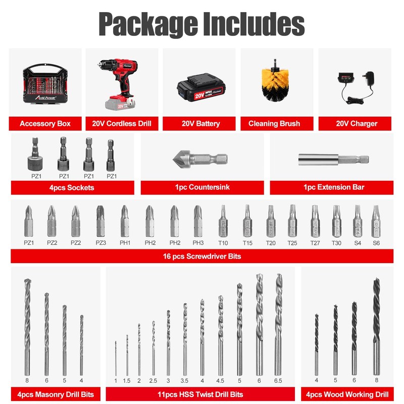 - [What's Included] : 20V Cordless drill, Lithium-ion battery, charger, 41Pcs accessory set (Drill & Screwdriver Bits, Extension bar, Sockets), cleaning brushes, metal belt hook, Instruction manual, and a double-end driver bit, US-based customer support.