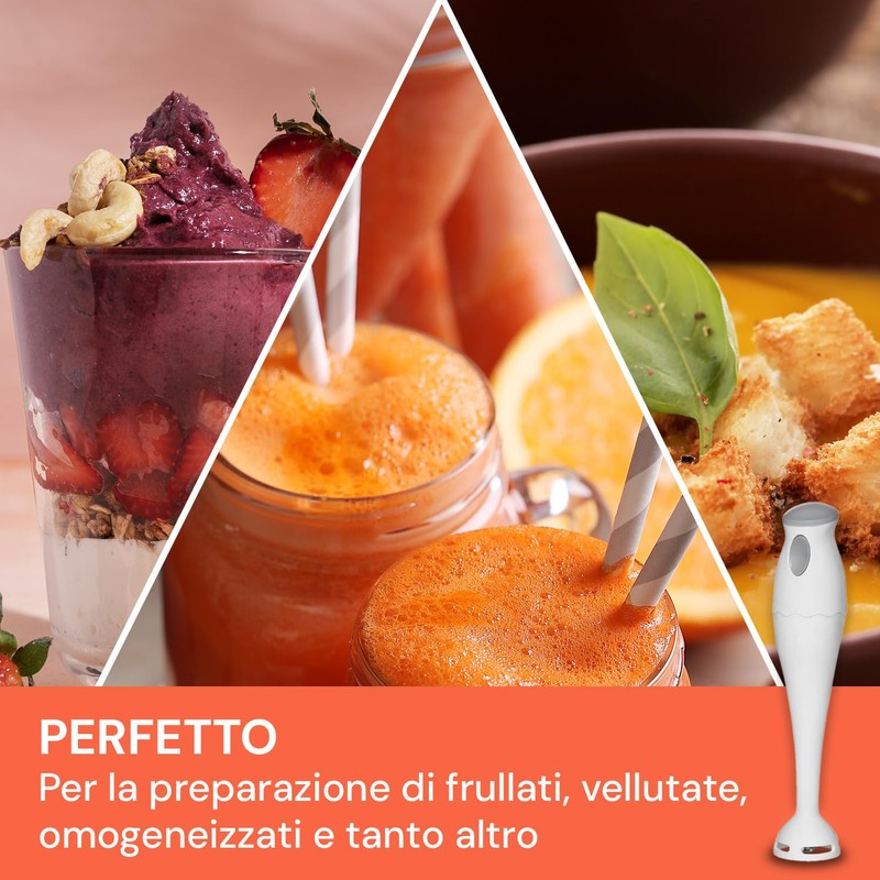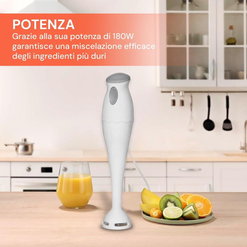 - Powerful 180 Watt hand blender: ideal for preparing smoothies, smoothies, soups and sauces in minutes, thanks to the power of 180 watts, which guarantees effective mixing of even the toughest ingredients.