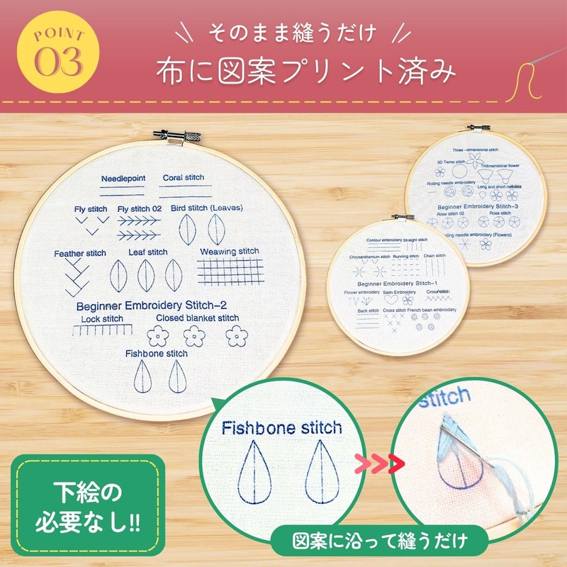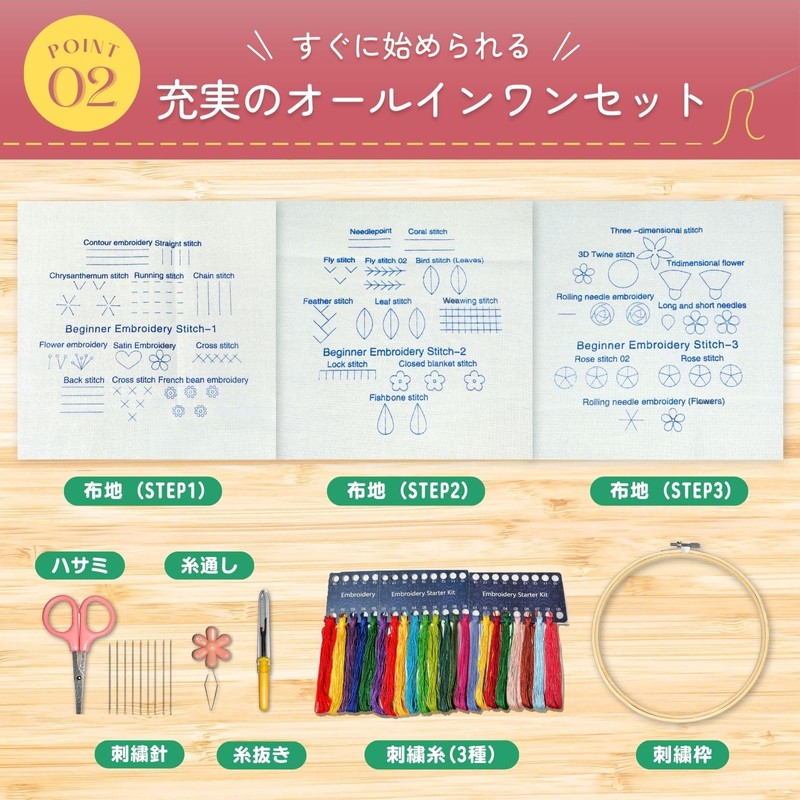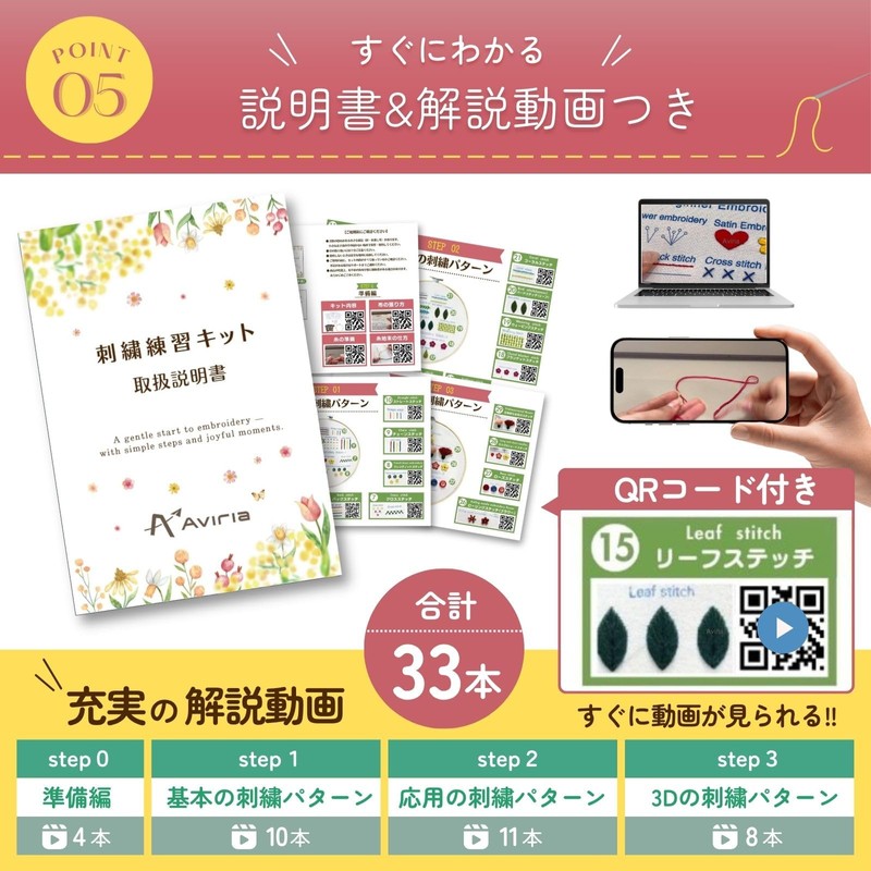 Aviria Embroidery Beginner's Kit | 3 Practice Cloths, 9 Embroidery Needles, 22 Bundles of Embroidery Thread, Wooden Frame, Japanese Instruction Manual & Video Instruction Manual Included | Supports 30