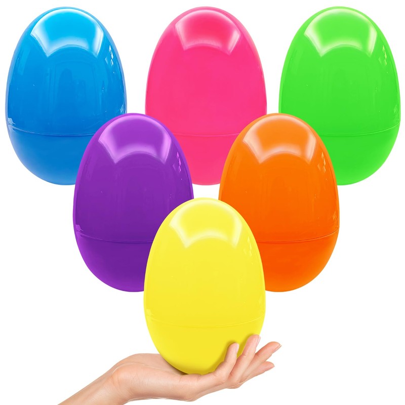 - 【VALUABLE PACK】Comes with 6pcs of high-quality, reusable plastic Easter eggs in 6 different colors: yellow, blue, green, pink, purple and orange. Each egg measures 6" × 4", making them the perfect big size for Easter party favors or egg hunt eggs.