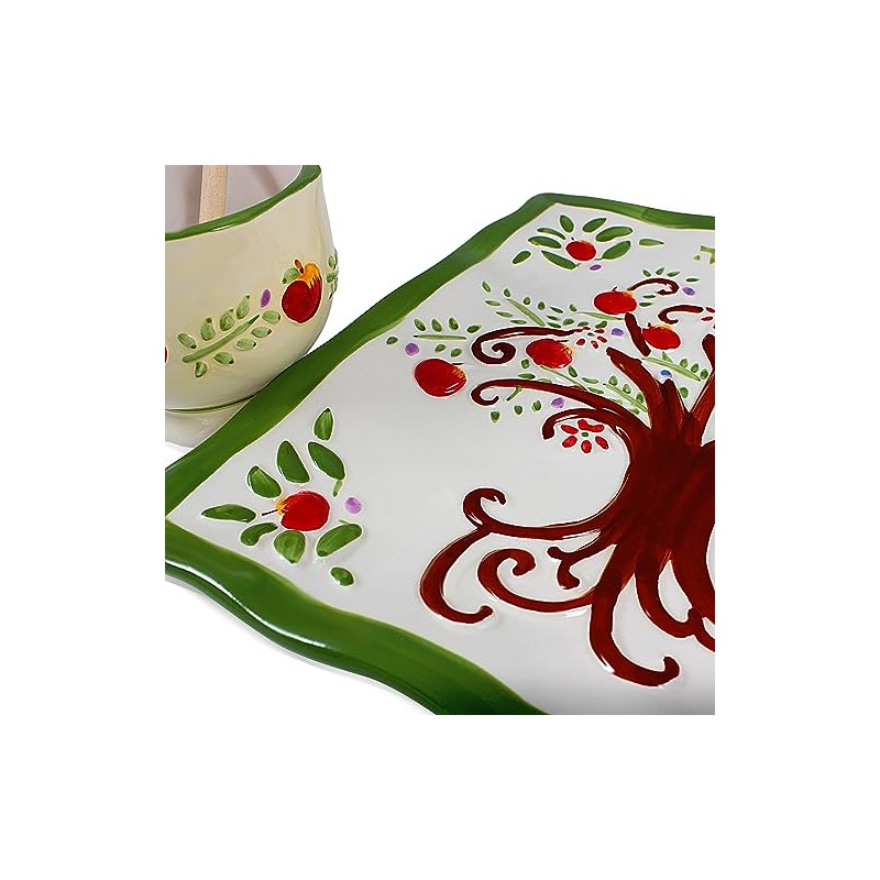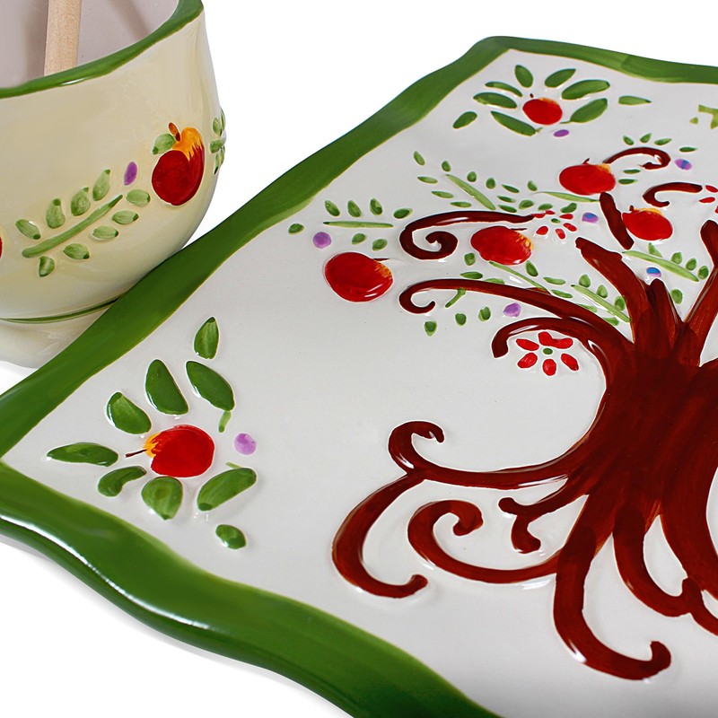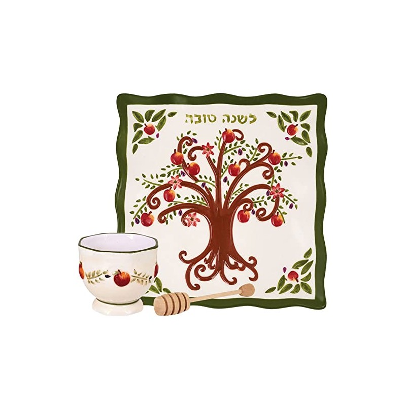 Aviv Judaica Rosh Hashanah Honey Plate Painted Apple Tree of Life Shana Tovah with Honey Bowl Dish and Honey Dipper Designed by Jessica Sporn Perfect Rosh Hashunah Platter Jewish New Year Gift