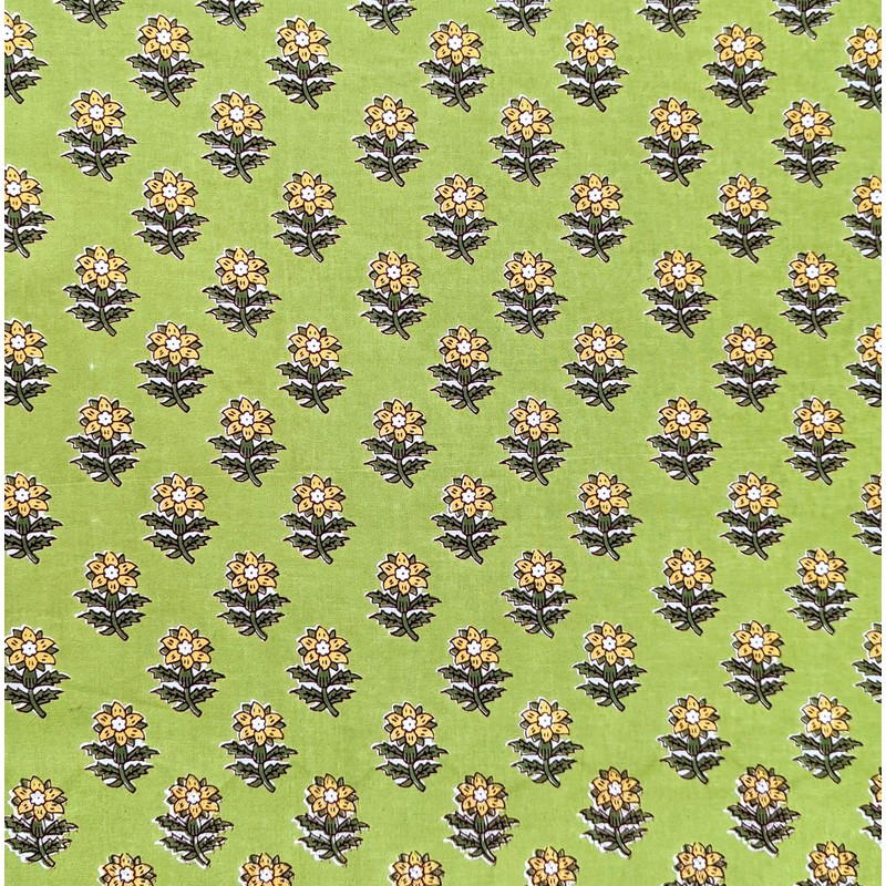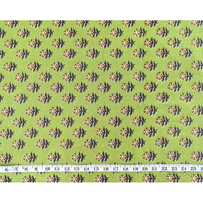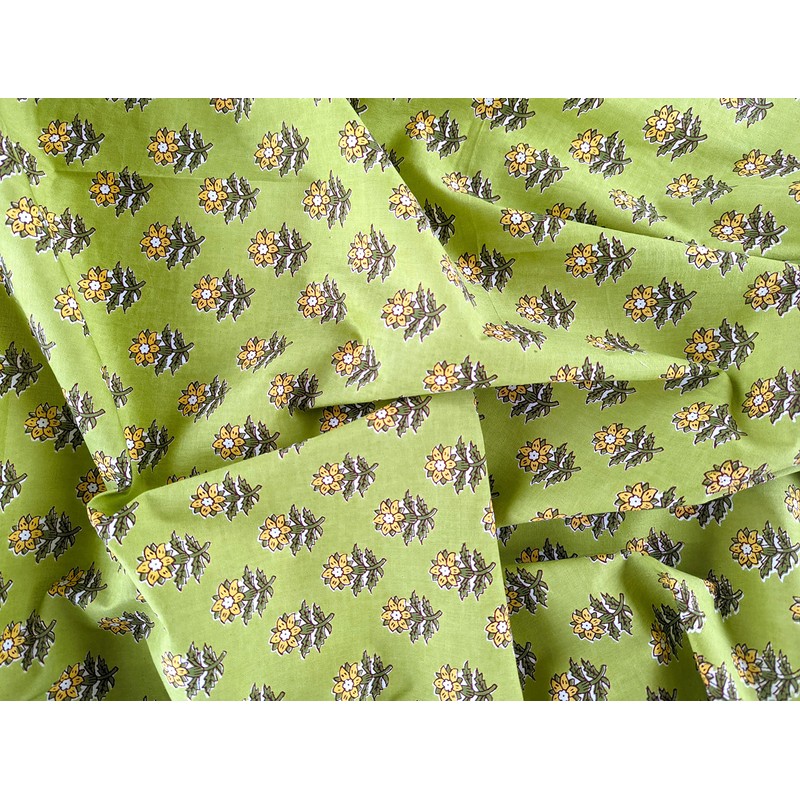 AVKA Studio Hand Block Print Fabric by The Yard - PRECUT 3 Yard 42 Inch Width - 100% Cotton Material - Green Floral Pattern - Light Weight Indian Cloth for Making Summer Dress Tops Indian Fabric etc