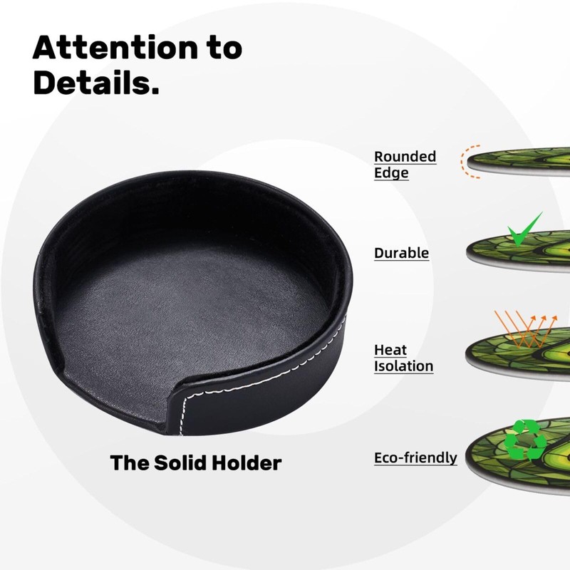 - 【6 Pcs Drink Coasters】Coasters Set Includes 6 Pcs Round Leather Coasters (3.9 Inch) And A Black Leather Coaster Holder. Our Leather Drink Coasters Have More Than 12 Different Patterns And Other Themed Coasters To Meet Your Different Coaster Needs To The Greatest Extent, Which Are Both Practical And Can Decorate Your Desk, Office, Coffee Table.