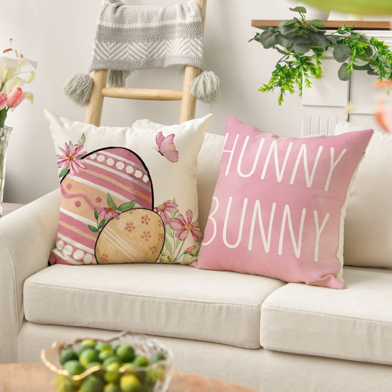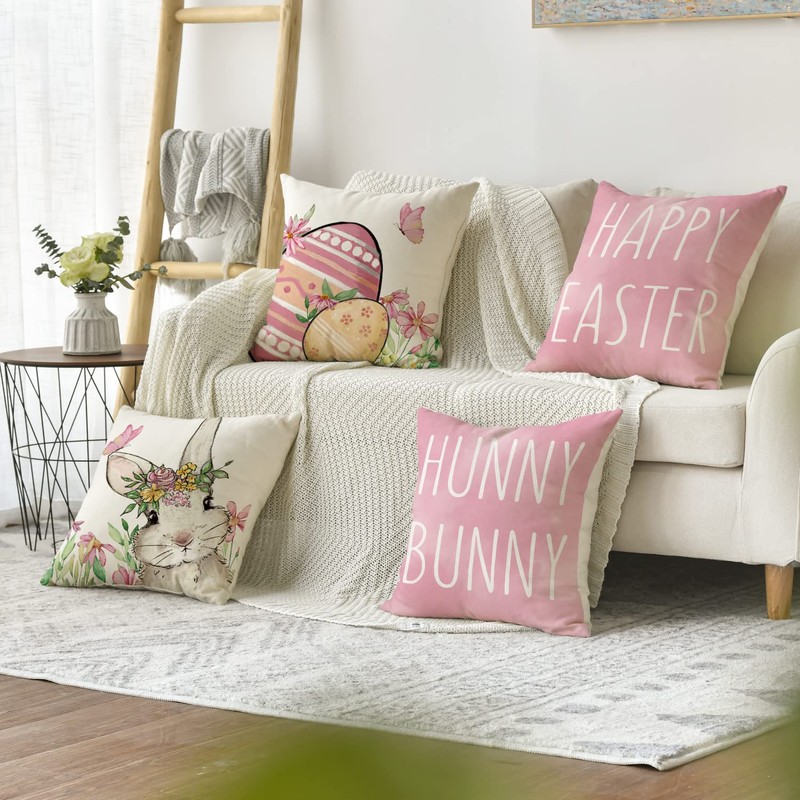 AVOIN colorlife Happy Easter Hunny Bunny Pink Throw Pillow Covers, 18 x 18 Inch Easter Eggs Bunny Spring Cushion Case for Sofa Couch Set of 4