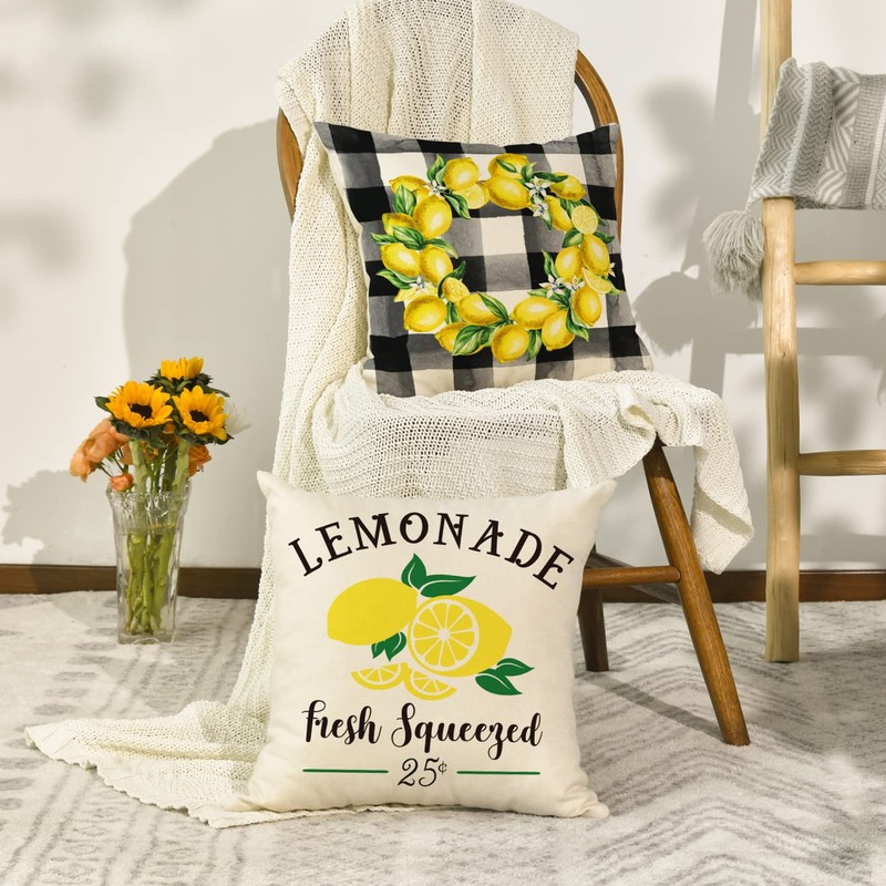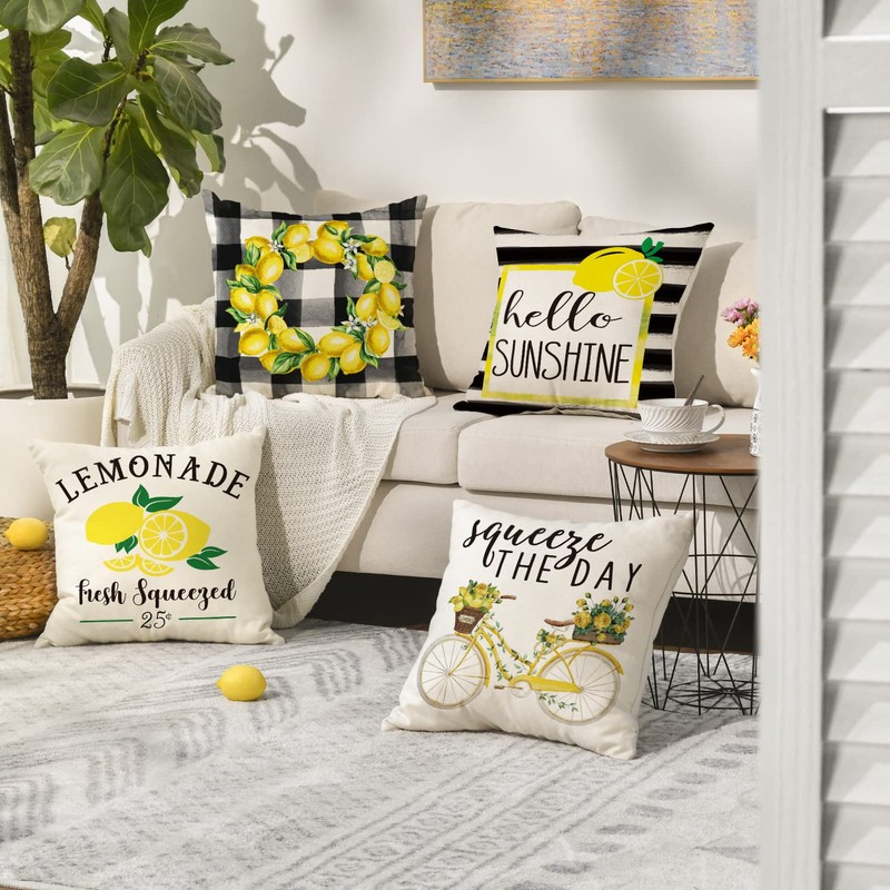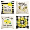 AVOIN Watercolor Stripes Hello Sunshine Throw Pillow Cover, 18 x 18 Inch Buffalo Plaid Lemon Wreath Bicycle Squeeze The Day Cushion Case for Sofa Couch Set of 4