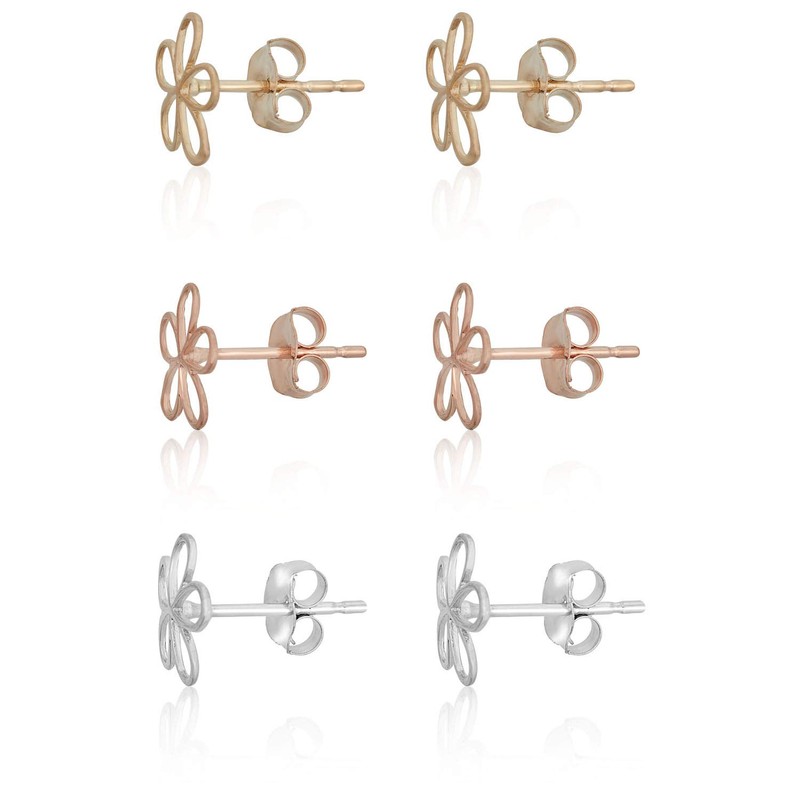 • These sweet floral studs set is budding with stylish bliss. Designed to match any attire and fashioned in 10K gold, this set features a pair of rose gold, white gold and yellow gold studs in an open flower design. Buffed to a bright finish, these earrings secure with friction backs. The earrings measure 7.5mm in length and width.
