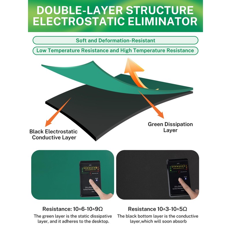 - Double-Layer Construction: Featuring a top layer of static dissipative rubber and a bottom layer of black conductive rubber, this mat withstands high temperatures, soldering, and exposure to harsh chemicals. It is wear-resistant and easy to clean, making it perfect for various applications.