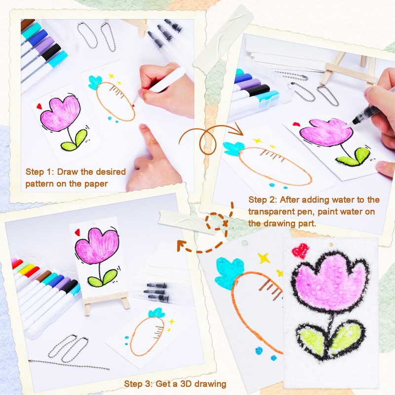 - Package and Sizing:This fluffy paint painting set includes 10 rectangular foam-textured papers measuring 4.3 * 2.8 inches, 1 pack of 12-color markers, 1 wooden easel measuring 4.9 * 2.8 inches, 10 metal chains measuring 4.7 inches, and 3 fountain pens measuring 6.1 inches, meeting the basic needs for artistic creation