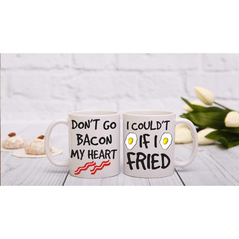 - Calidad duradera: hecha de cerámica de gres de alta calidad suave y resistente a los arañazos para una durabilidad excepcional. El diseño con texto en inglés "Don't Go Bacon My Heart", no podría ser si me frito, está impreso en ambos lados de las tazas, lo que lo convierte en una gran opción para uso diestro o zurdo. Nuestras tazas de 325 ml son el regalo perfecto, para compromisos, Navidad, cumpleaños, aniversario de boda, día de San Valentín, novia y novio, luna de miel, despedida de soltera, regalo de novia o cualquier otra razón por la que quieras mostrar apreciación.