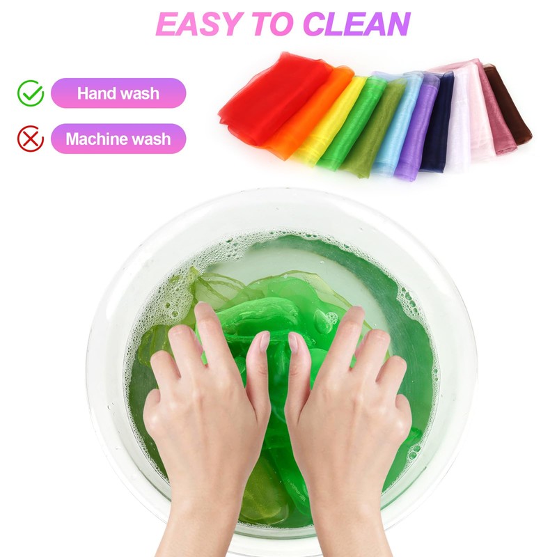 Reusable & Washable The chiffon cloth set can be washed in cold water, but not bleached or tumble dried. Store flat and air dry to avoid damage, color loss and shrinkage