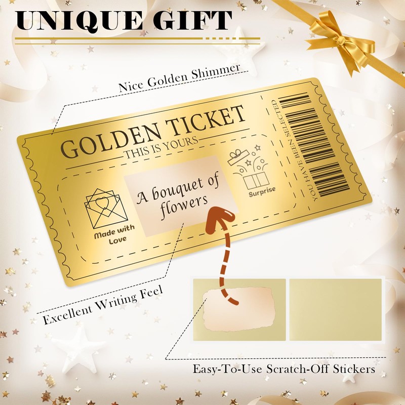 - Unique surprise: our Golden Ticket scratch cards offer an extraordinary way to give special events or invitations. They allow the giver to customise the cards, which adds a very personal touch. The receiver experiences the magical moment when scratching, which makes the surprise even more intense