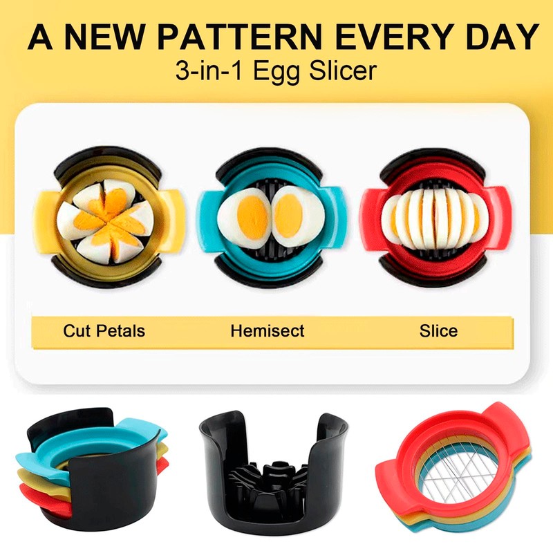 - Einschließlich: 3pcs Eierschneider mit unterschiedlichem Schnittmuster und 1pc Ei platzierte Basis.