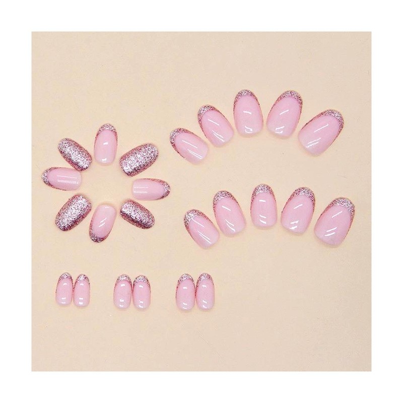 AWAVM 24PCS Almond Press on Nails Short, French Tip Fake Nails Glossy Pink Glitter False Nails with Glue Stickers, Oval Acrylic Full Cover Glue on Nails for Women and Girls