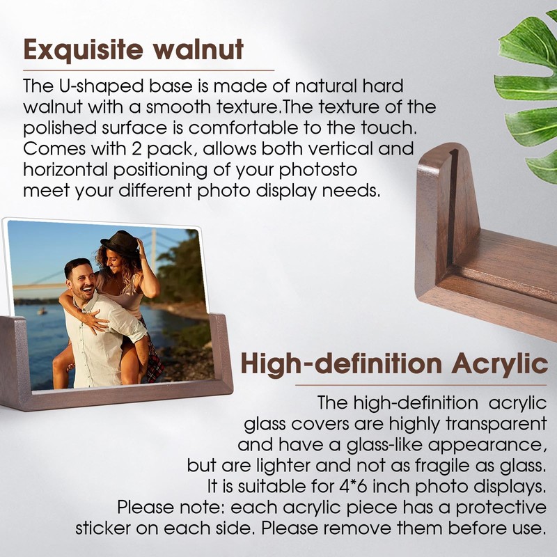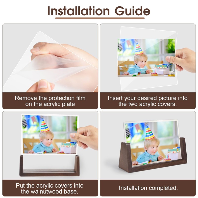 - 【Easy Installation】:Before using the photo frame,remove the protective film on both sides of the acrylic glass,place the photo between the two pieces of acrylic glass,and place it on a walnut base.Simple and convenient,no need for other tools