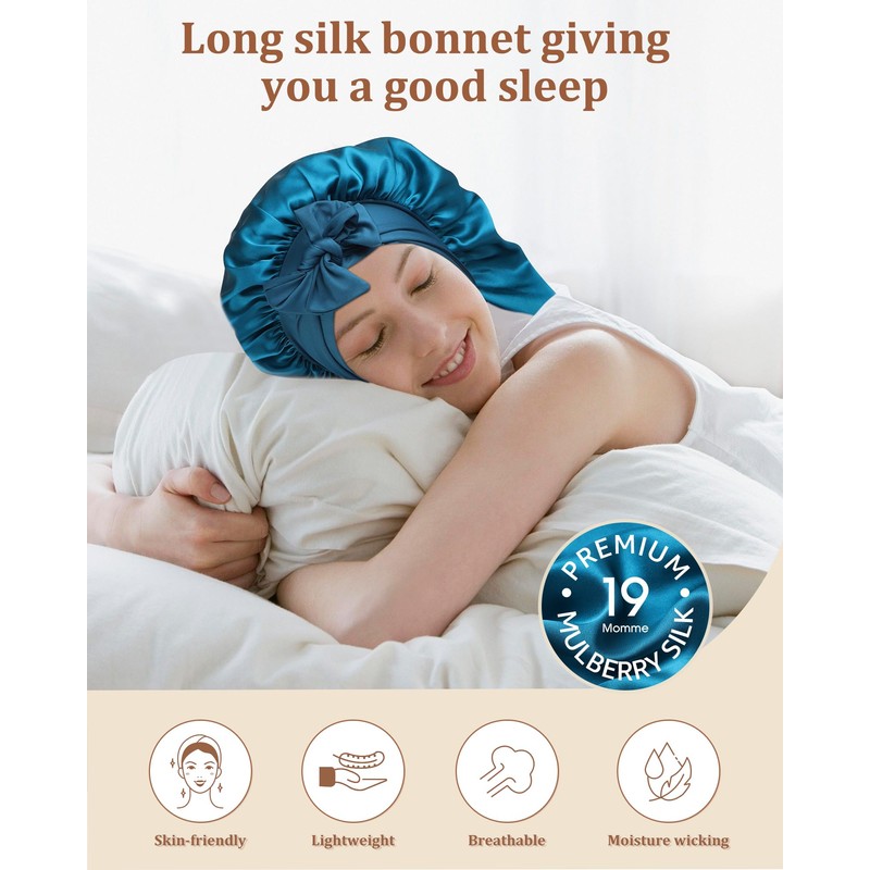 - Mulberry Silk Bonnet: The long bonnet is made of high-quality 100% mulberry silk, which is skin-friendly and breathable. It can effectively help the hair lock moisture when sleeping at night