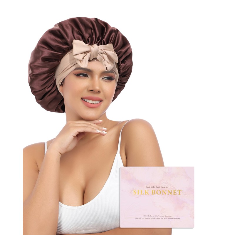 AWAYTR Silk Bonnet for Sleeping Women 100% Mulberry Silk Bonnet with Band 2 Layer Reversible Hair Bonnet Sleeping Hair Wrap (Silk, Dark Brown/Light Champagne)