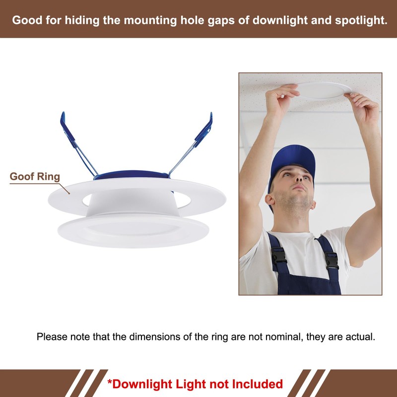 - Application: This Trim Ring is a lamp hole replenish ring,primarily used to hide mounting hole gaps in downlights and spotlights. By using this trim ring, you can achieve a seamless appearance on your ceiling, similar to adding spacers to LED lights. It effectively covers any imperfections such as torn drywall, damaged areas, mis-cuts, or oversized holes, giving your ceiling a clean and tidy finish.