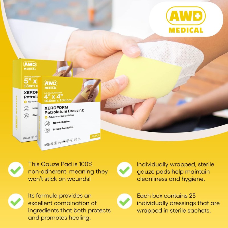 AWD Medical Xeroform Petrolatum Dressing - Non-Adhering Gauze Pad - Fine Mesh Gauze Patch Sterile - Healthcare Supplies for Wound Care, Burns, Lacerations, & Skin Grafts Aide (Box of 25) (4"x4")