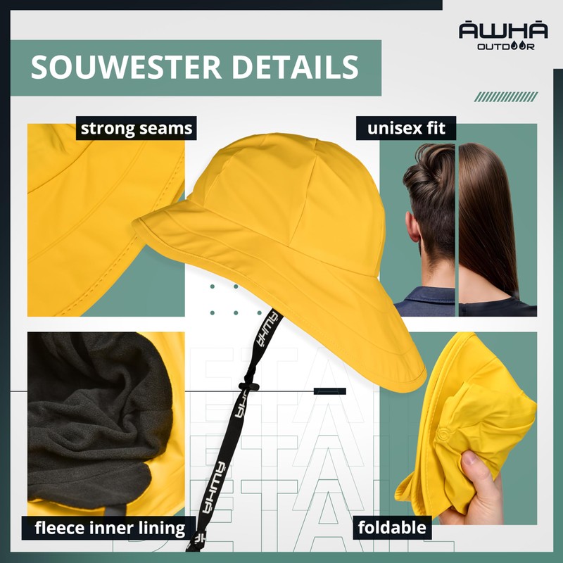 - ALL ROUND DRY: Imagine cold rain running down your neck. That won't happen to you with the AWHA Souwester, because the brim is wider at the back and offers optimum neck protection. It is narrower at the front so that your view is not obstructed.