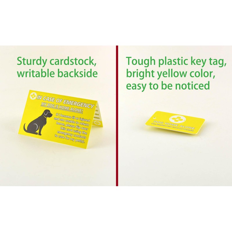 - ENSURE YOUR DOGS' SAFETY AND CARE. If you especially single dog owners become ill or injured while you are outside of your home being unable to go back, our Awical bright yellow dog home alone key tag can easily alert first responders to use emergency contact(s) information on dog emergency card to call someone and let them know your dogs are home alone needed care.