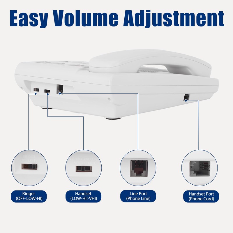 - Volume Control: Easily control the ringer with OFF, Low, or High settings—loudness up to 120dB. The handset offers 3 volume levels (Low, HI, and VHI), while the speakerphone reaches up to 96dB, making it an excellent choice for seniors with hearing difficulties