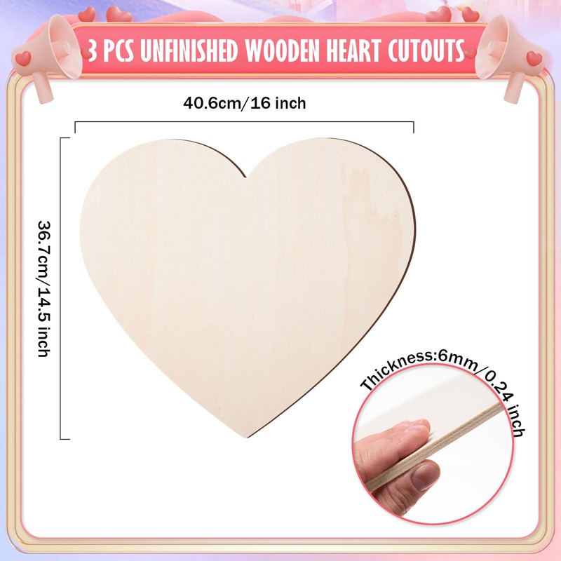 - 16 Inch Wooden Hearts for Crafts: you will receive 3 pieces of large wooden heart cutouts, the wood heart is about 40.6 x 36.7 cm/16 x 14.44 inches, and the thickness is 6 mm/0.24 inches, the large size and lovely heart shape can meet your needs of decorations and DIY crafts projects