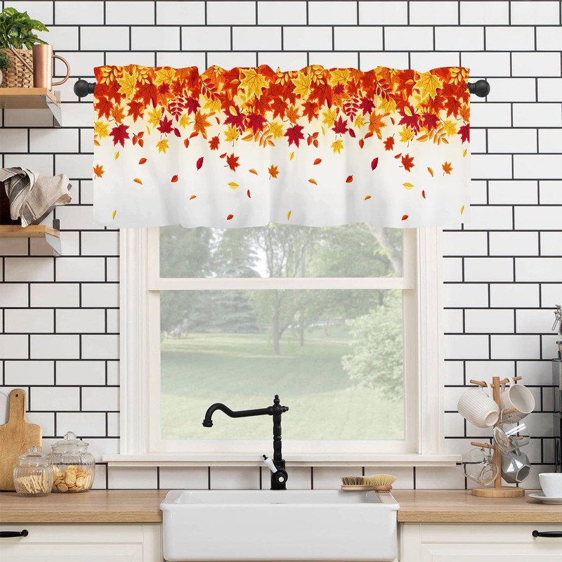 - Excellent Material: The fall thanksgiving maple leaves valance for windows is made of high quality polyester, lightweight and soft.Can be hung alone or mix with other curtains. Delicate stitching at the boarder make sure its long-lasting use.It can be used to friends and relatives.