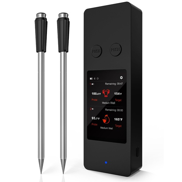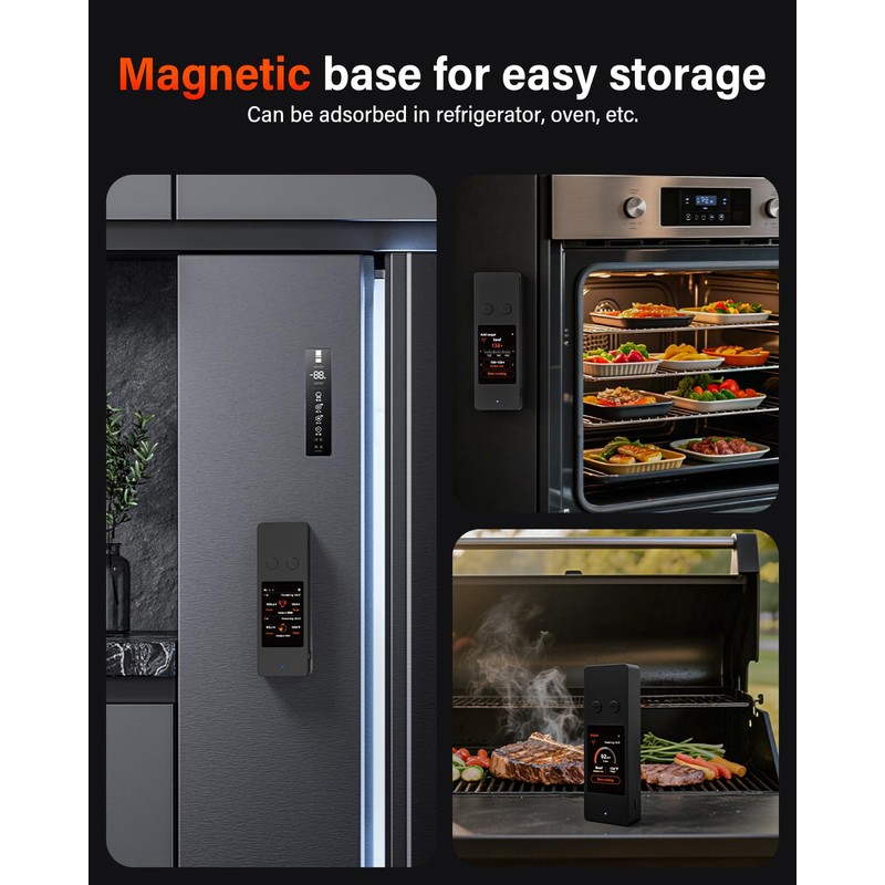 - [App-Like On-Device UI — No Phone Required] Pop out a probe and start cooking. The touchscreen base runs the built-in app, and avoids the usual headaches of phone apps—pairing failures, device incompatibility, and privacy access to contacts or location. Just tap, set your target, and go.