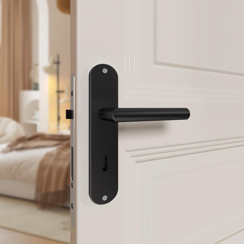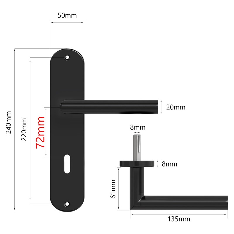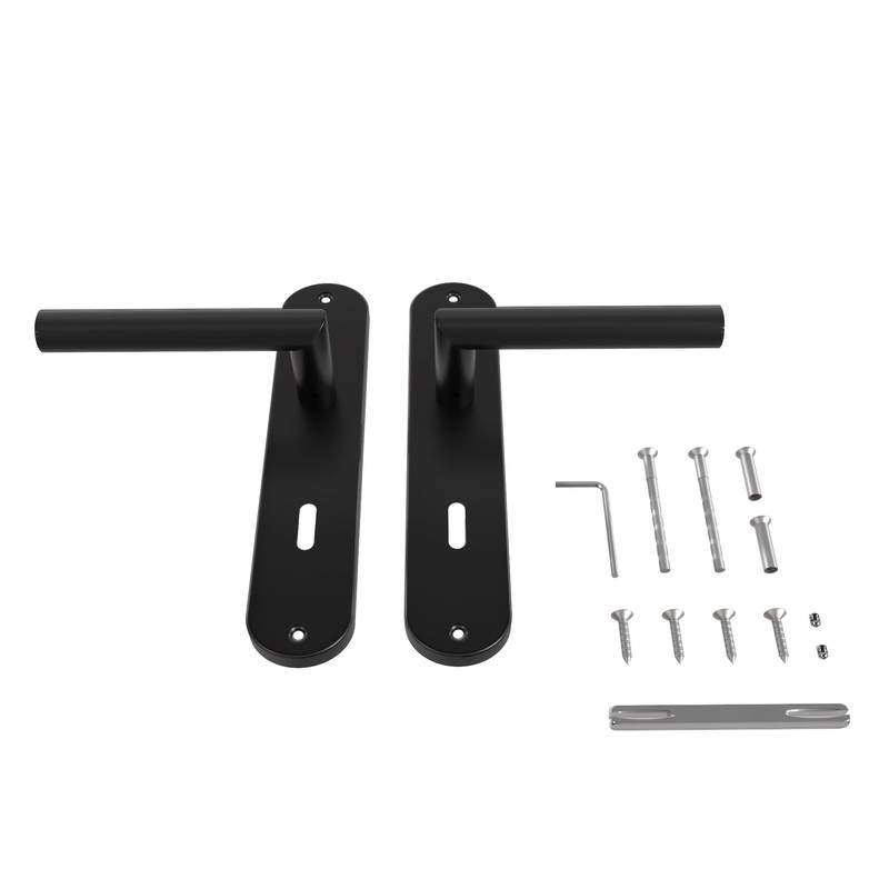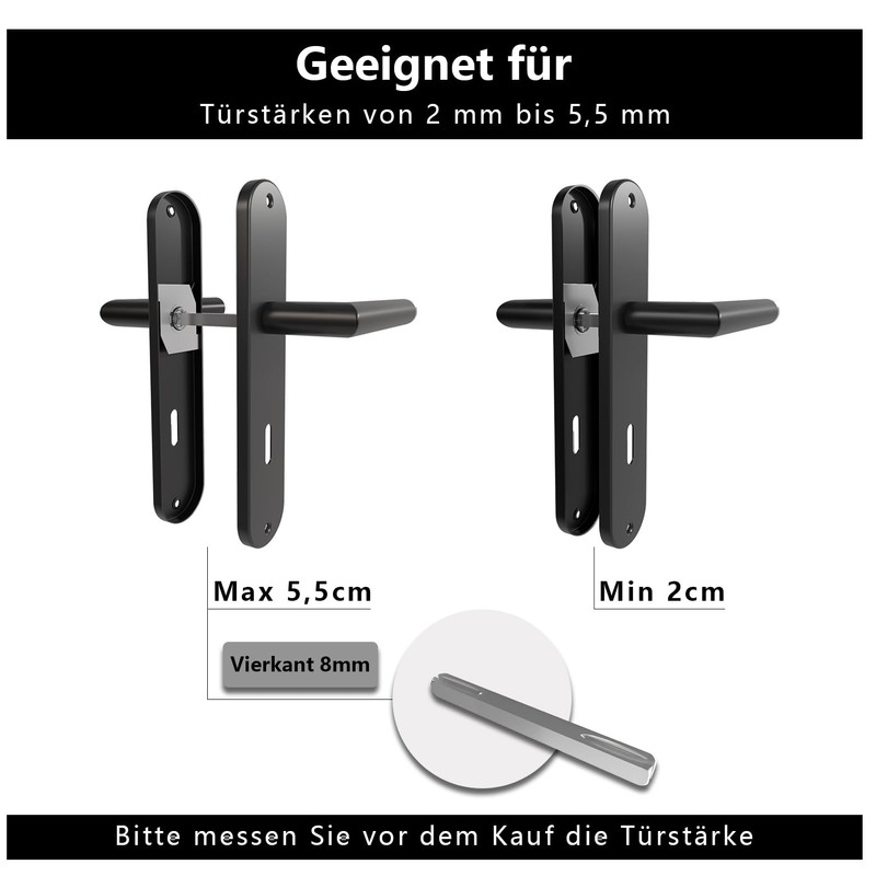 - ? Rostfreier Edelstahl mit schwarzer, matt-spritzlackierter Oberfl?che 1 Zimmertr-Beschl?ge: Ma?e Beschl?ge (H x B): 240 x 50 mm, Klinken (L x ?): 135 x 19 mm, Abstand Klinken zu Tr: 61 mm, Abstand Klinken zu Schlsselloch: 72 mm Fr alle g?ngigen Schlafzimmer- und Innentren geeignet.