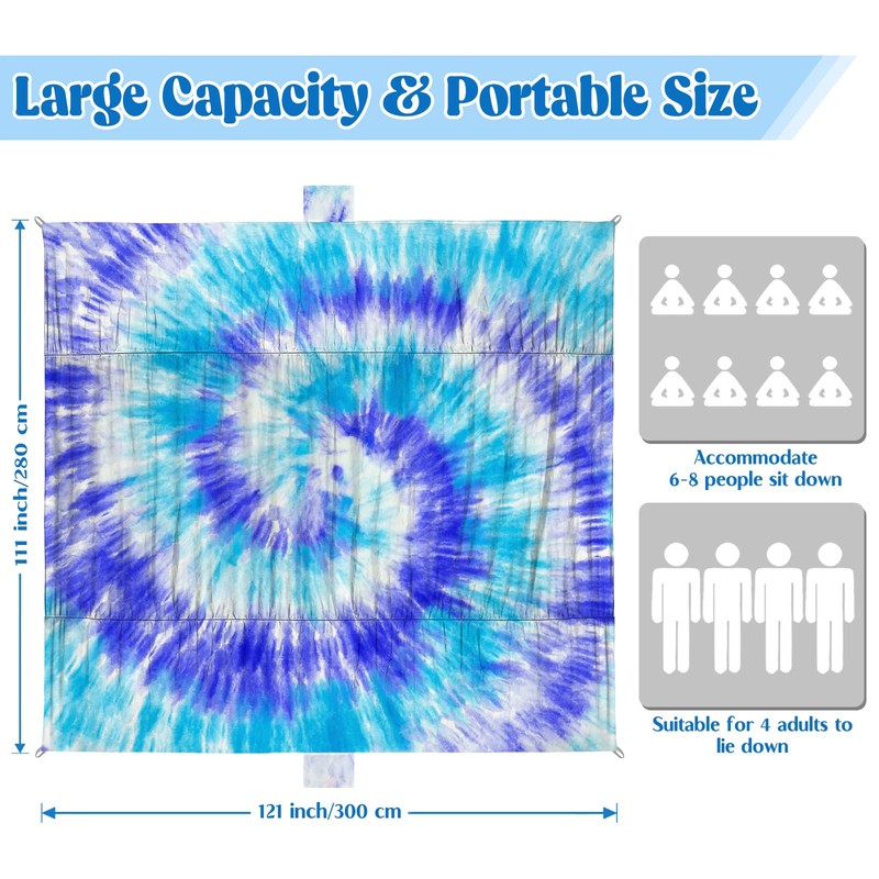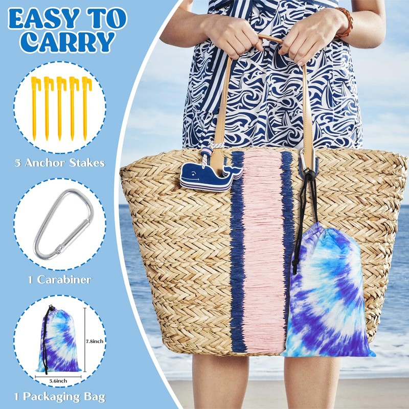 - WIND RESISTANT DESIGN: Our beach blanket comes with 5 stakes and 4 straps to accommodate 4 anchor rings so you have a spare stake just in case. If it's windy day, it can be nailed down on beach by stakes coming with our blanket.