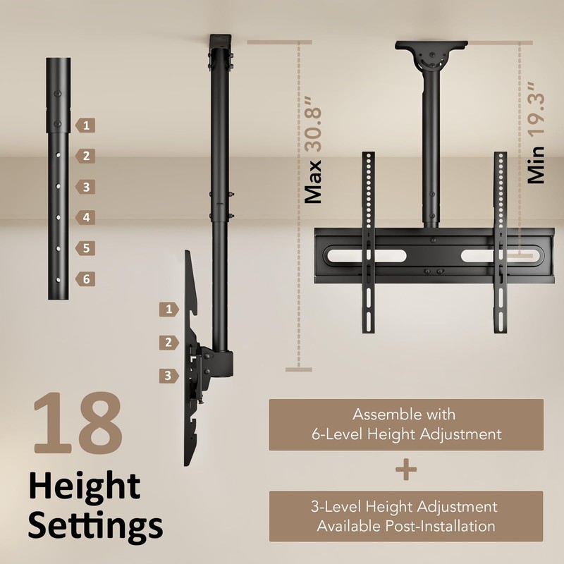 - Height Adjustable Design- Solid steel construction securely holds display and makes installation a breeze. This TV Ceiling mount can adjust height both bracket and Tube, the bracket have 3 level hight adjustable ,the tube have 6 level height adjustable, customer can choose the ways they want