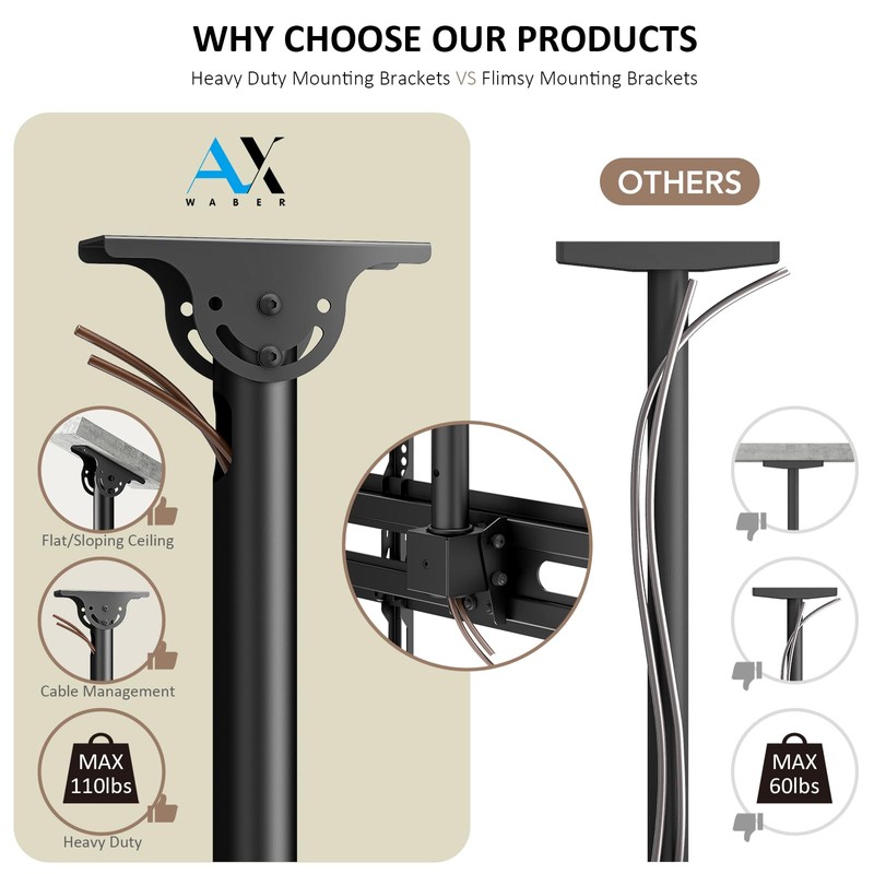 AX WABER AX WABER TV Ceiling Mount Adjustable Bracket Fits Most LED, LCD, OLED and Plasma Flat Screen Display 26 to 65 Inch, Maximum Load Capacity 110 Lbs, Mounting Holes 400x400mm (AX11TB01), Black
