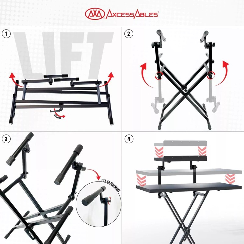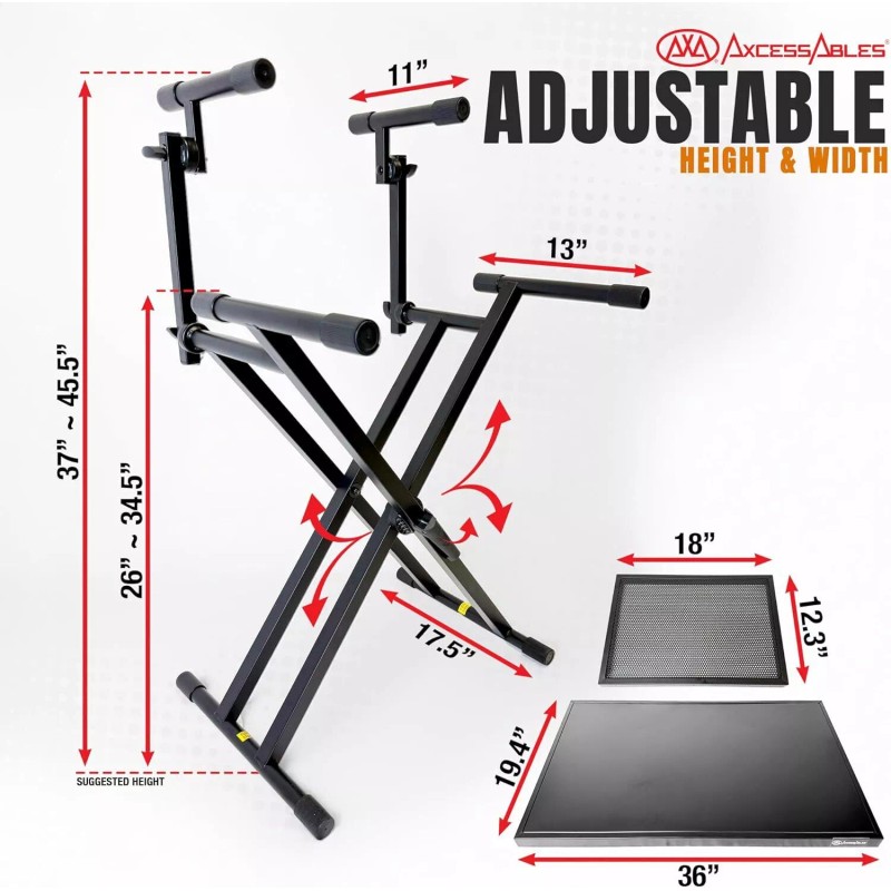 Patented Design This innovative stand features a patented design developed over two years to deliver the perfect combination of durability, functionality, and ergonomic convenience, setting a new standard for keyboard stands. Portable Tabletops for Enhanced Flexibility - The attachable tabletops turn your stand into a versatile workstation, perfect for sheet music, tablets, or additional equipment, making it ideal for on-the-go setups. Spacious, Versatile Tabletops for All Your Needs - The lower tabletop measures 36" x 19.5" for larger instruments, while the top 18" x 12.5" tabletop can tilt to hold tablets, sheet music, or books, offering endless configuration options. Ergonomic 2-Tier Design with Elevated Top Tier - The top tier sits 10 inches higher, providing an ideal layout for secondary equipment like laptops or compact keyboards, ensuring easy access during performances or production. Heavy-Duty Metal Build with 180lb Capacity- crafted with premium metal construction, this stand offers rock-solid durability and can securely hold up to 180lbs of gear, making it perfect for keyboards, mixers, and more. Weighing 39lbs, this stand is easy to set up, fold, and transport, making it perfect for gigs and studio work.Brand: | AxcessAbles |