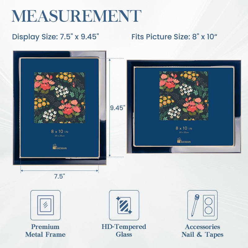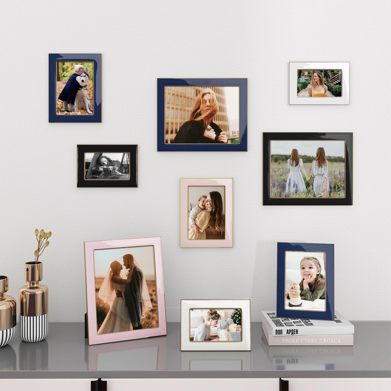 - [Premium Materials] The 8x10 picture frame is made of aluminum alloy material by precise craftsmanship, the gold/silver metal frame is electroplated for a modern and stylish finish. Hand-filled with enamel so that it dries smooth and shiny. Multiple colors and sizes are available to blend perfectly with a variety of room styles.