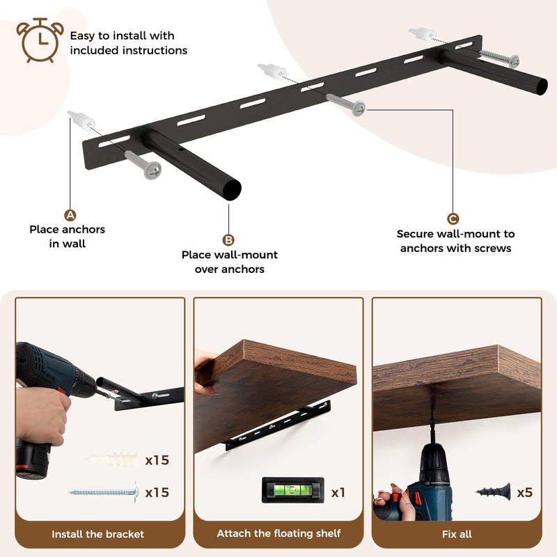 - Invisible Bracket for a Clean Look: Hidden steel brackets are used to firmly support the shelves without leaning or sagging for a true floating effect. The design provides a seamless, clutter-free appearance to enhance your toilet, desk, between windows, above fireplace or under TV.