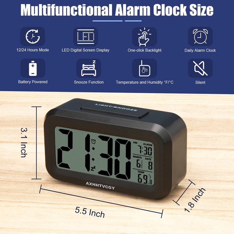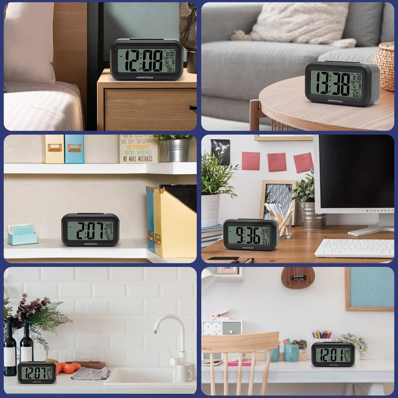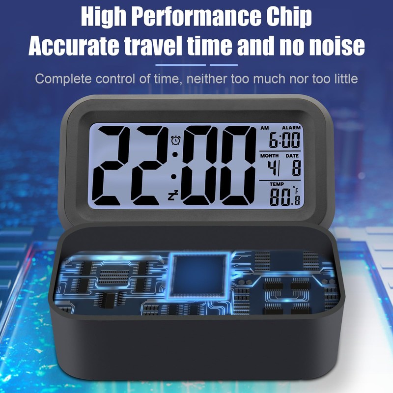 - Smart Sensor: The multifunctional digital alarm clock uses built-in ambient light sensor, the screen will automatically light up at night when it is dark, so you can see the time in the dark, humanised design. In addition, you can also turn it off, when you want to see the time, just press the top button, the screen will light up for 6 seconds, will not affect your sleep quality.
