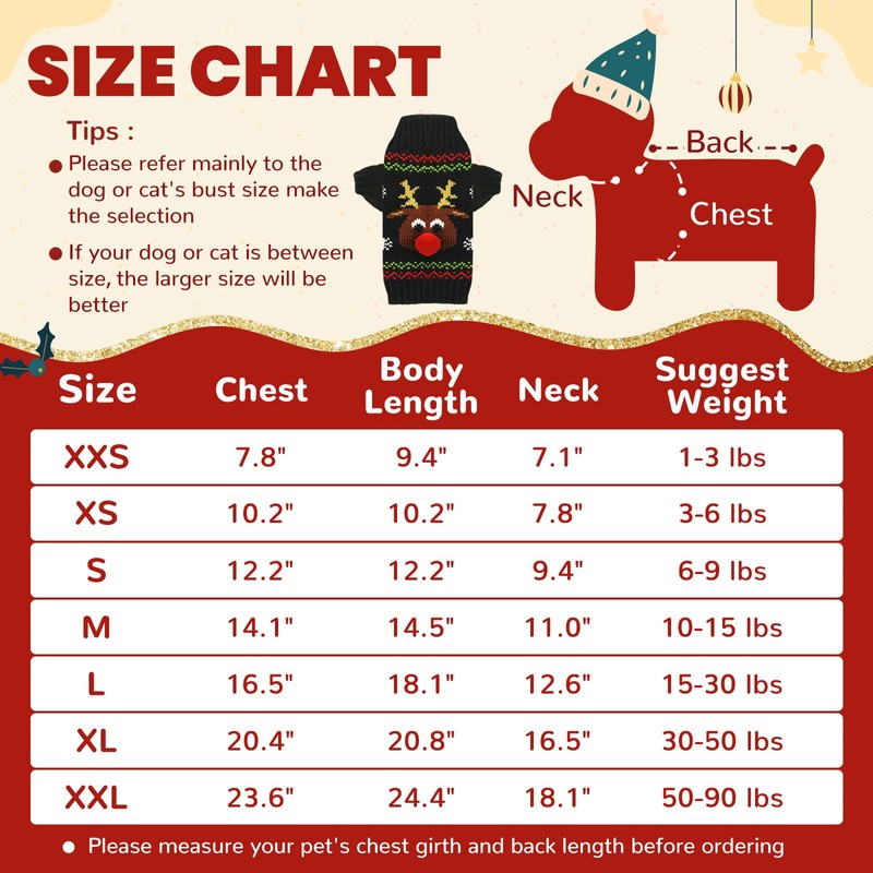 - ABOUT SIZE :To get suitable dog christmas sweaters, please don't choose the size based on your usual size .measures your dog or cat 's size from our chart