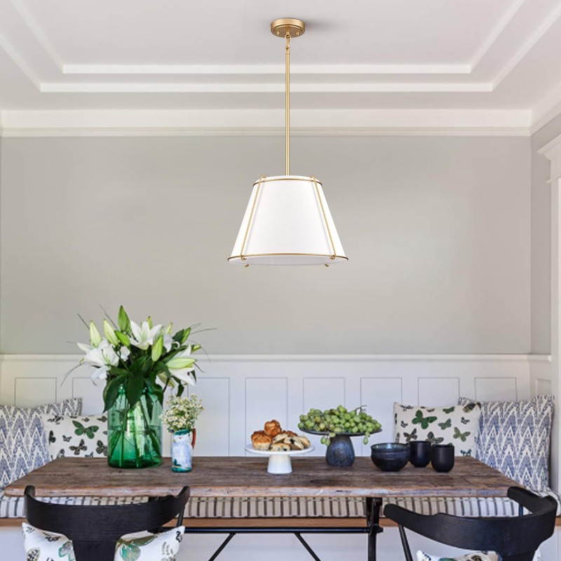 AXILAND Cone Pendant Light Fixture with Metal Lantern Fabric Drum Shade 16" White and Gold Chandeliers for Kitchen Dining Room Living Room Bedroom