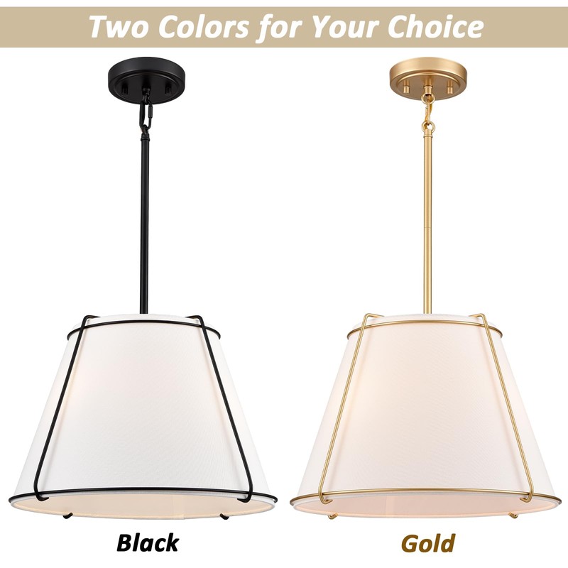 - 【Fixture Dimension】Gold kitchen pendant lights width of the top and bottom are respectively 9 1/2" and 16", cone fabric drum shade height 11", total 4 rods, adjustable length Max 42".
