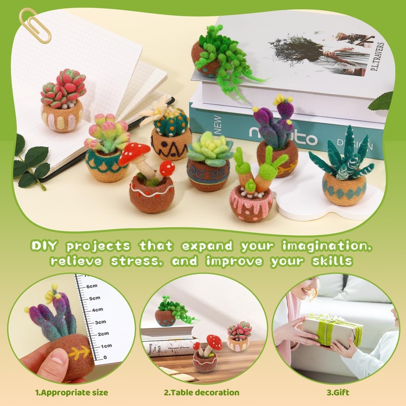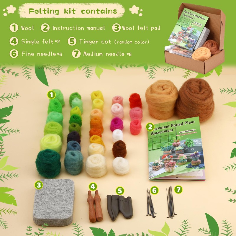 - Complete Needle Felting Kit: Felting kits for beginners adults provide enough multi-color wool to complete 9 images of succulent pots. It also includes 6 thick felting needles, 6 thin felting needles, 2 single felting needle handles, 1 wool felt pad(11.8*8.5*2.5 cm), a pair of finger cots, and 1 detailed instruction manual. A complete set of tools guarantees a flawless wool felting project.