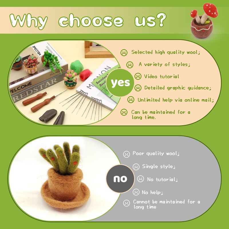 - Full of Life: The succulent potted plants with 9 images are perfect felting kits for everyone. They can not only be made together with family members to promote mutual affection and cultivate a family atmosphere, but also improve hands-on ability. It is also an indispensable part of home decoration.