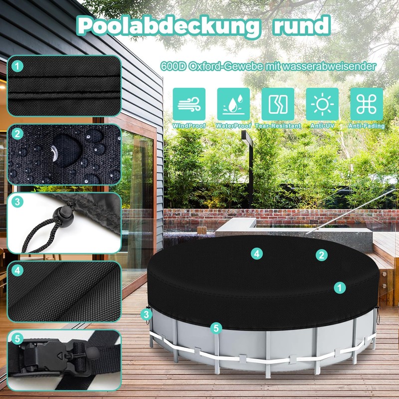 - Material: the pool cover is made of high-quality 600D Oxford fabric. The high density material can better prevent dust and is more wear-resistant and tear-resistant in bad weather. In the middle of the pool cover there are 4 drainage holes, round pool cover prevents dirt, leaves and rubbish, in and contaminates your pool.