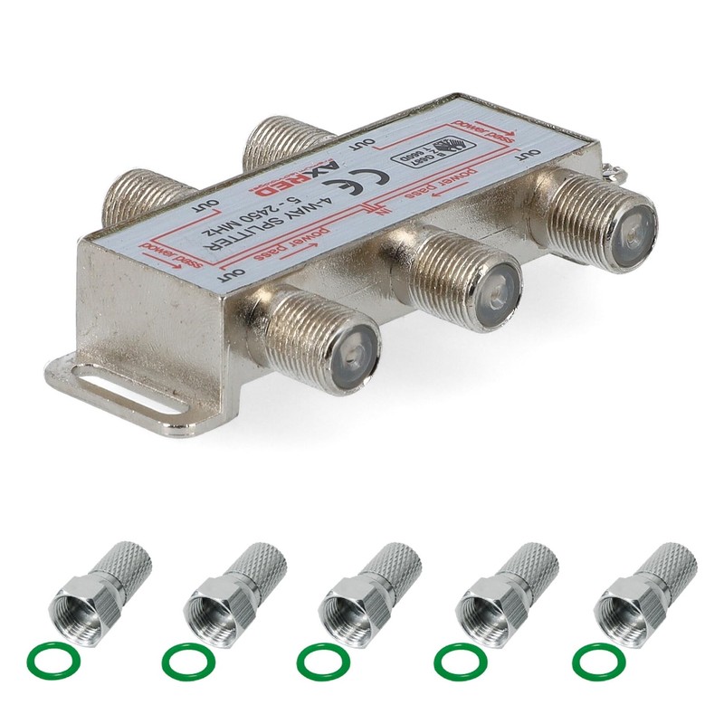 Axred Satellite Splitter 4-Way + 5x Anadol F-Connectors, for Distribution of 1 Antenna Signal to 4 Devices (Receiver/TV/FM Radio) 3-Way Satellite Splitter Satellite Switch Antenna Splitter