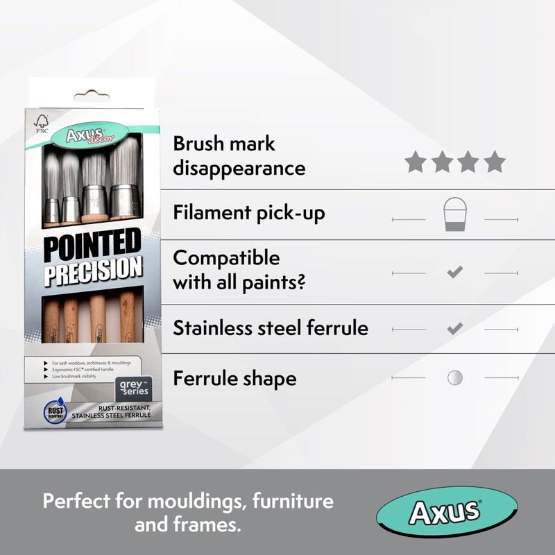 - Super-fine, tapered, synthetic filaments achieve a smooth finish with minimal brush marks