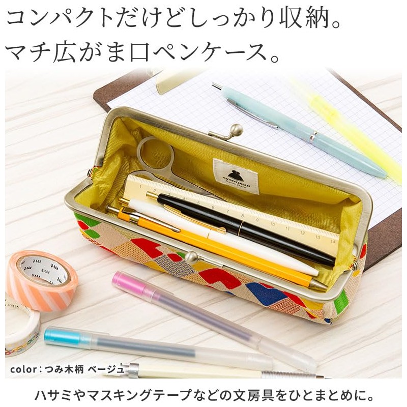 Compact but secure storage. Gusseted Pencil Case A simple nagato pen case with no dividers in a cologne shape like a bale. The wide gusset allows you to store not only pens, but also scissors and masking tape stationery in one place. The base opens wide so you can see the contents and remove them easily. It is large enough to hold cosmetics such as mascara, eyeliner, and hot buffer, so it is also recommended to use as a cosmetic pouch.